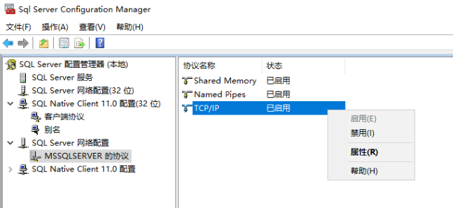 打开 SQL Server 配置管理器,展开 SQL Server 网络配置,找到 <实例> 协议 TCP/IP,右键属性