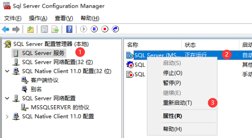 SQL Server 配置管理器 中,找到 SQL Server 服务,找到实例,右键重启